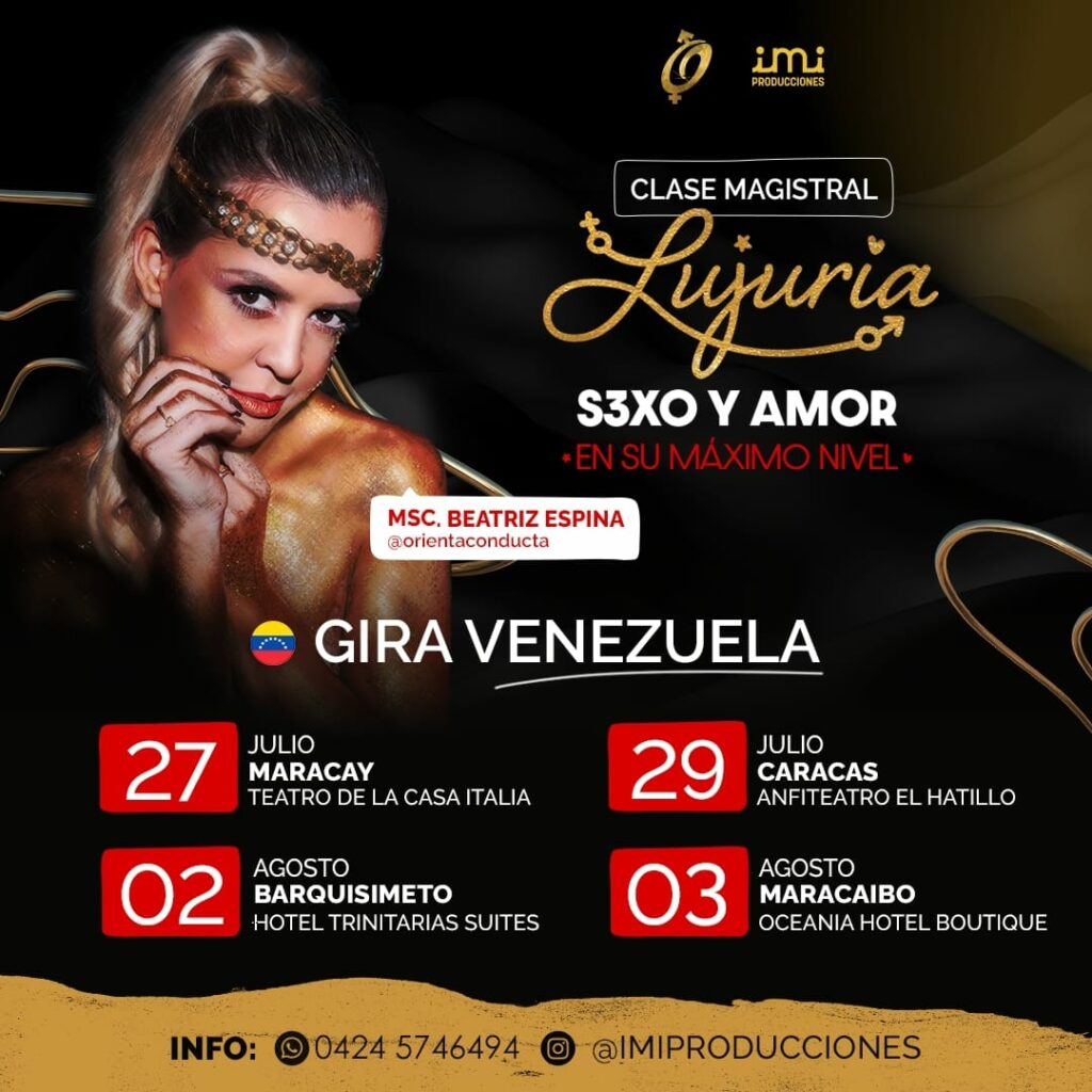 La autora y sexóloga venezolana Beatriz Espina regresa a Venezuela con su gira “Lujuria: Sexo y amor en su máximo nivel”, una conferencia en modo de clase magistral que parte de años de investigación que se traducen también en el libro “Vivir, Amar y ser Feliz: Con buen Sexo”. Esta gira es posible en el país gracias a imi Producciones, bajo la producción general de Jesús Somaza.