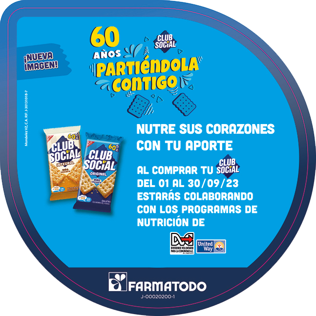 Desde el 1ero hasta el 30 de septiembre, el 3% de las ventas de Club Social original e integral se donará a los programas de nutrición del Dividendo Voluntario para la Comunidad, favoreciendo a un grupo importante de localidades en el área metropolitana. Esta es una de las actividades enmarcadas en su campaña de aniversario «60 años partiéndola contigo».