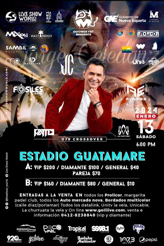 El renombrado cantante y compositor Jorge Celedón, reconocido a nivel mundial por su talento en el género de vallenato y ganador de cinco premios Grammy Latinos, se prepara luego de 10 años de ausencia para deleitar a su público en Margarita con un espectáculo musical inolvidable.