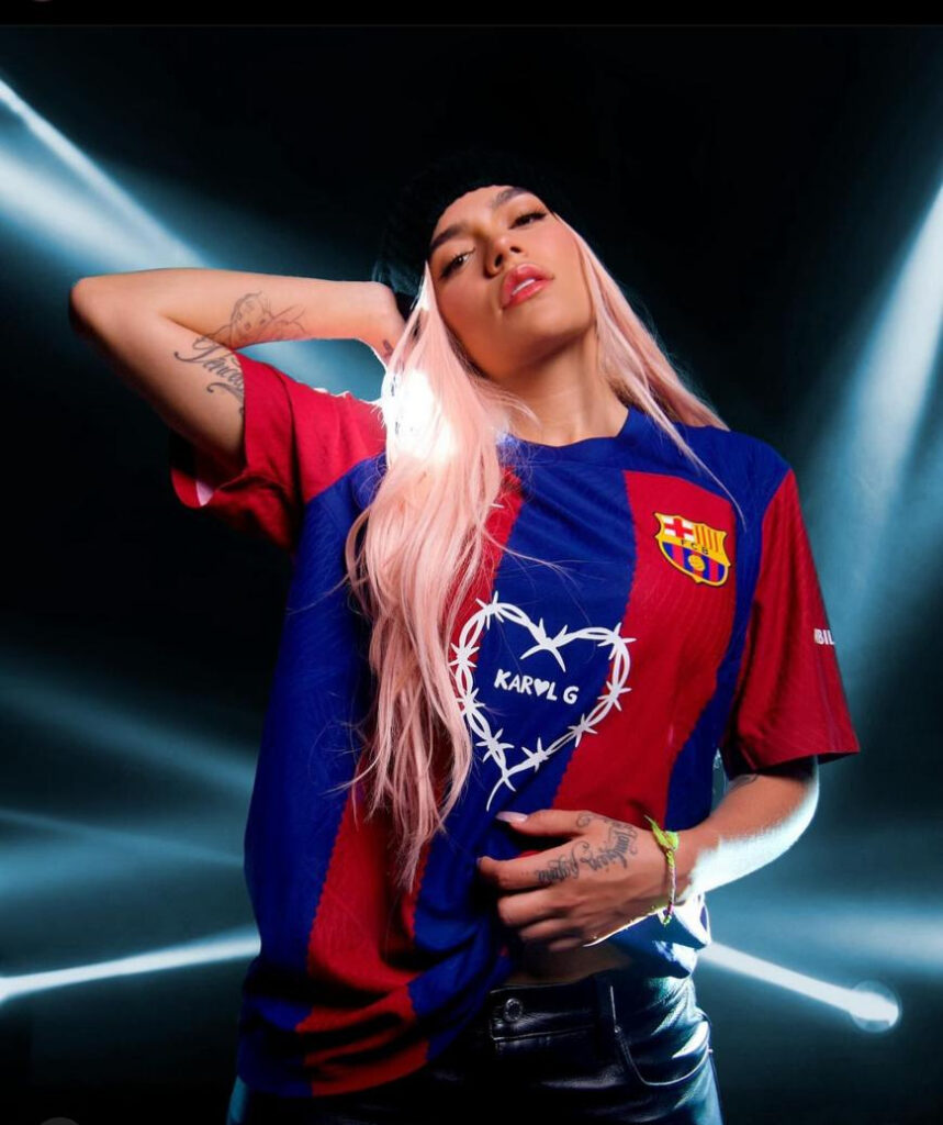 “El símbolo del corazón representa en lo que se convirtió en el estilo ‘Bichota’, un momento de mi vida en el que encontré fuerza, resistencia y apoyo. Poder verlo en la parte delantera de una camiseta que inspira esa misma energía, gracias a Spotify y al FC Barcelona, es realmente significativo”, comentó Karol.