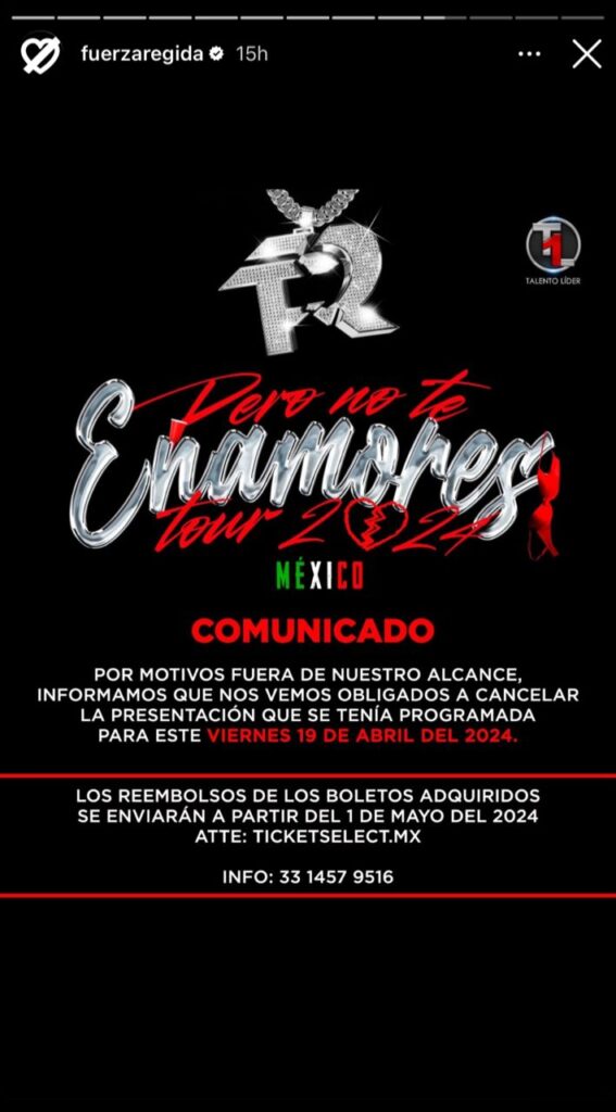 Seguidamente, minutos después, la banda de Regional Mexicano compartió el mismo comunicado que informaba la cancelación de su Tour “Pero no te enamores 2024”, en la ciudad de Cancún, que se estaría realizando este viernes 19 de abril.