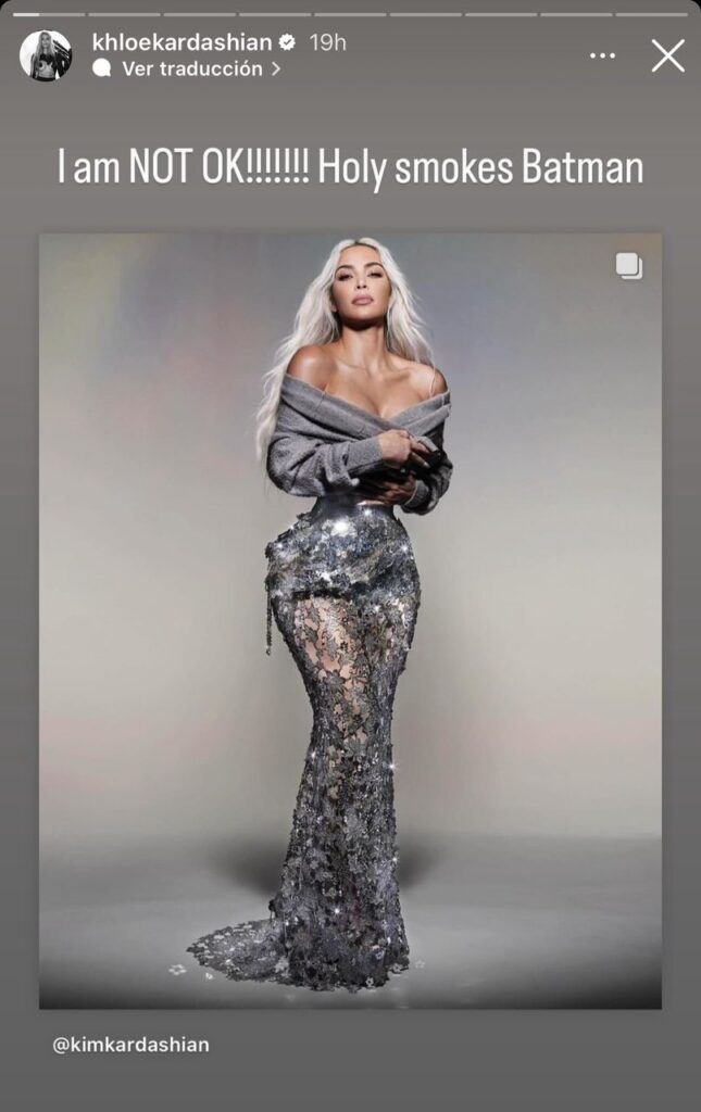 A través de sus historias en Instagram, Khloé compartió su opinión sobre cada atuendo de sus parientes. «No estoy bien. ¡Santo Dios, fuma Batman», escribió junto a la imagen del outfit de su hermana Kim Kardashian, quien vistió un ajustado corsé Maison Margiela Artisanal diseñado por John Galliano.