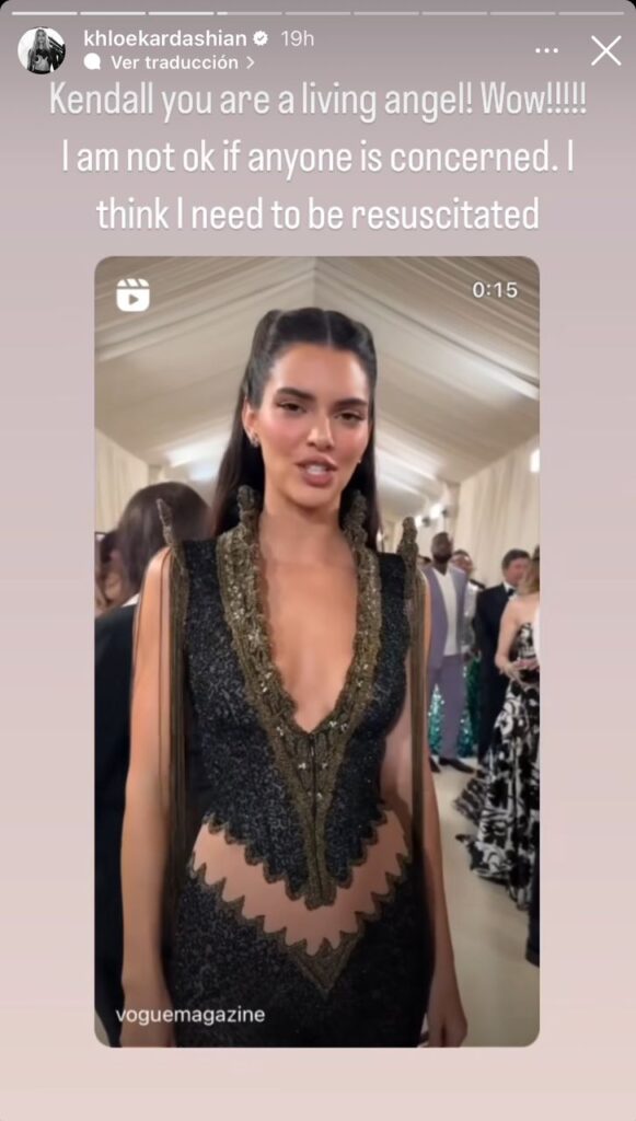 Igualmente, elogió a su hermana Kendall Jenner: «¡Eres un ángel viviente! ¡¡¡¡Guau!!!!! No estoy bien si alguien está preocupado. Creo que necesito ser resucitada». La exángel de Victoria Secret llevó un vestido que pertenece a la colección de Alta Costura de McQueen para Givenchy 1999.