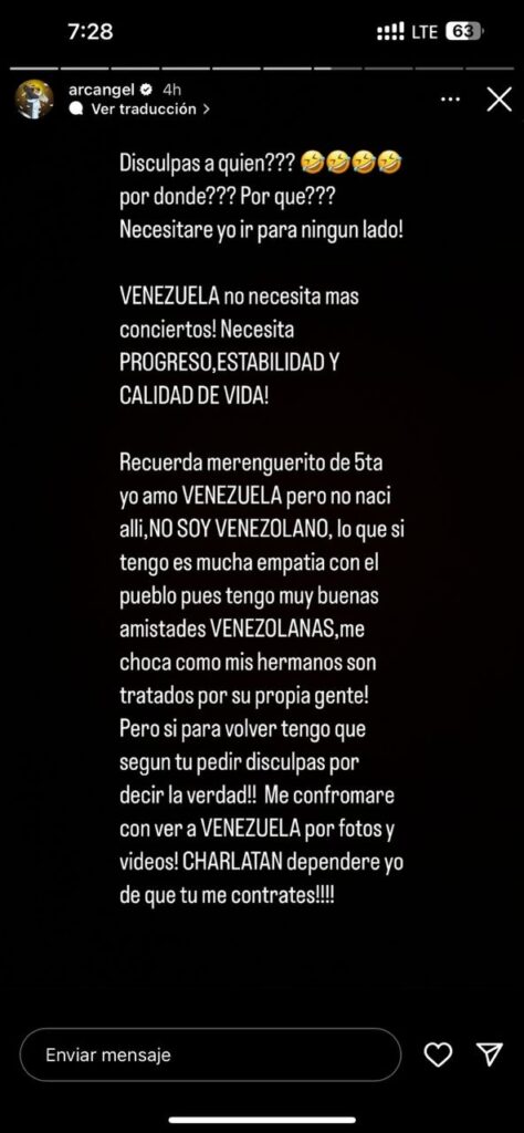 Ante esto, Arcángel manifestó su opinión de una manera totalmente única. En su historia de Instagram, el artista compartió un mensaje con un enfoque distinto. «VENEZUELA no necesita más conciertos», expresó Arcángel, dejando claro que su prioridad es el progreso, la estabilidad y la calidad de vida para el pueblo venezolano.