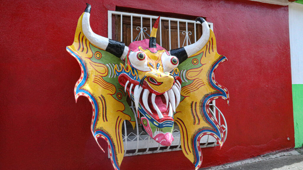 En esta fiesta de la iglesia católica los Diablos danzan al son del repique de la caja, un tambor típico y bailan por las calles del pueblo, en diferentes altares y frente a la iglesia representando el desafío del mal ante el bien, pero cuando se está frente a la presencia de Jesús en la Eucaristía la máscara guinda hacia el piso como señal de rendición y no poderle vencer.