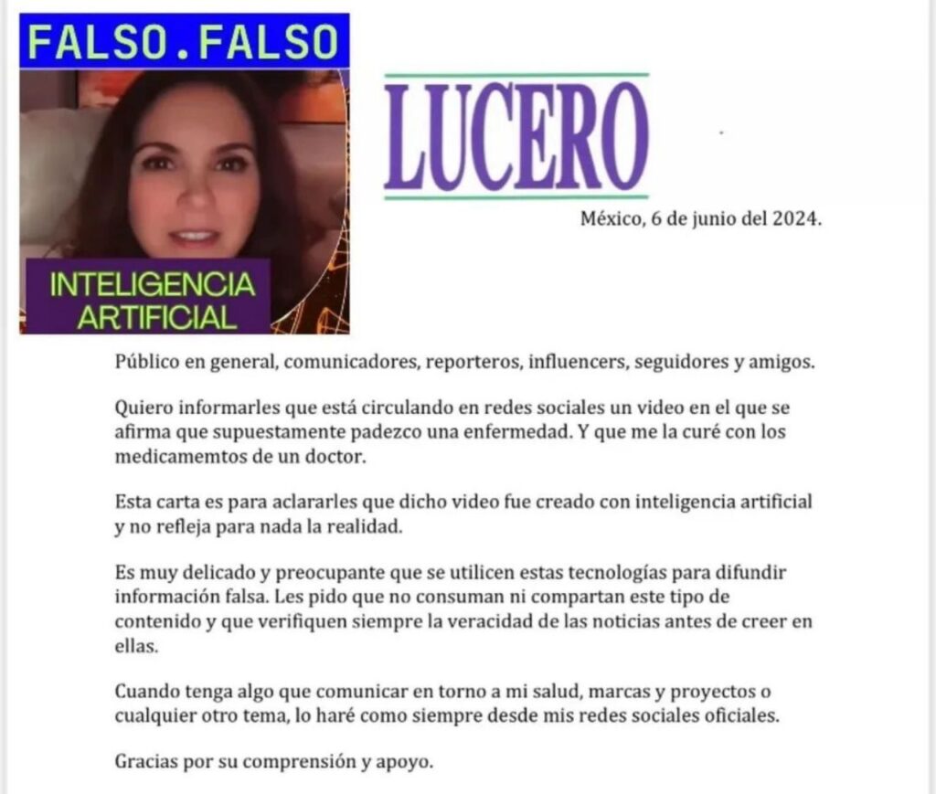 Posteriormente, la mexicana expresó que el material fue creado con la tecnología, e invitó a su audiencia y a la prensa a verificar la veracidad de los contenidos, antes de hacerse eco de información falsa. «Es muy delicado y preocupante que se utilicen estas tecnologías para difundir información falsa», señaló Lucero.