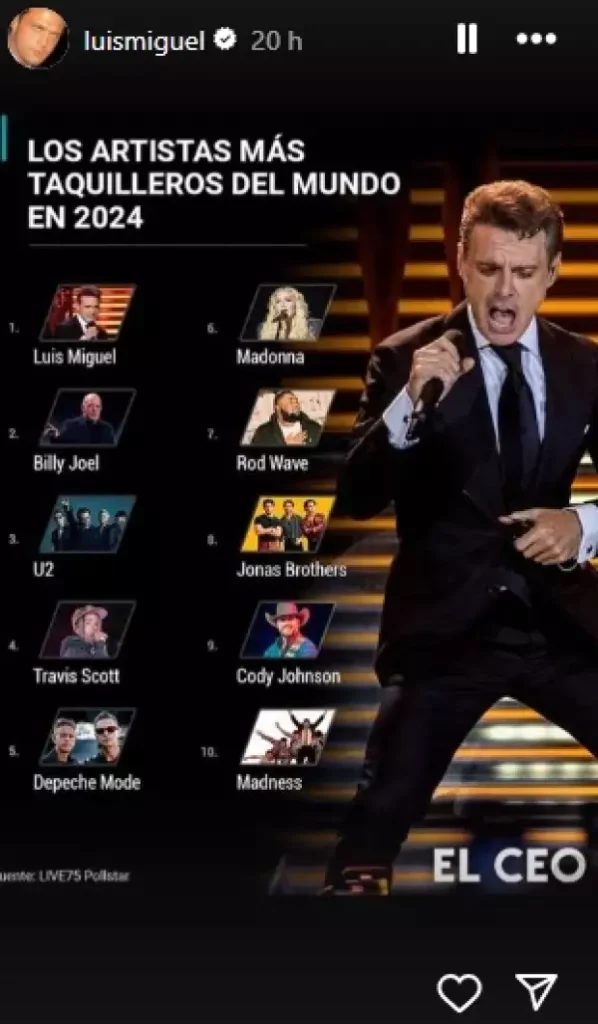 “Luis Miguel Tour” se consagra como la gira más taquillera del mundo en el ranking Live 75 de Pollstar que clasifica los tours en función de las entradas vendidas, superando a U2 y Madonna. El artista continúa con un éxito increíble en su gira mundial con producción de Fenix Entertainment y Cárdenas Marketing Network, Inc. CMN e Iglesias Entertainment”, indicó la publicación.