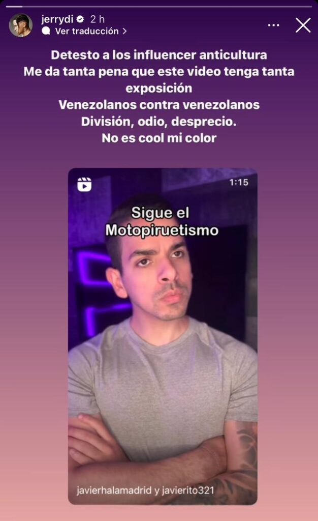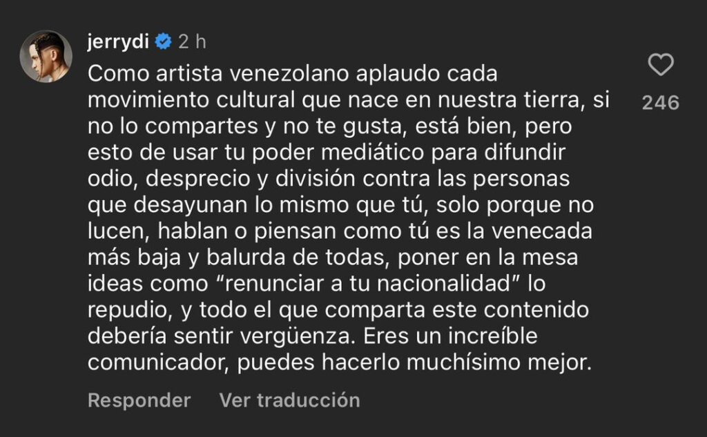 «Como artista venezolano aplaudo cada movimiento cultural que nace en nuestra tierra, si no lo compartes y no te gusta, está bien, pero esto de usar tu poder mediático para difundir odio, desprecio y división contra las personas que desayunan lo mismo que tú, solo porque no lucen, hablan o piensan como tú es la venecada más baja y balurda de todas, poner en la mesa ideas como renunciar a tu nacionalidad, lo repudio y todo el que comparta este contenido debería sentir vergüenza», comentó Jerry Di en la publicación.