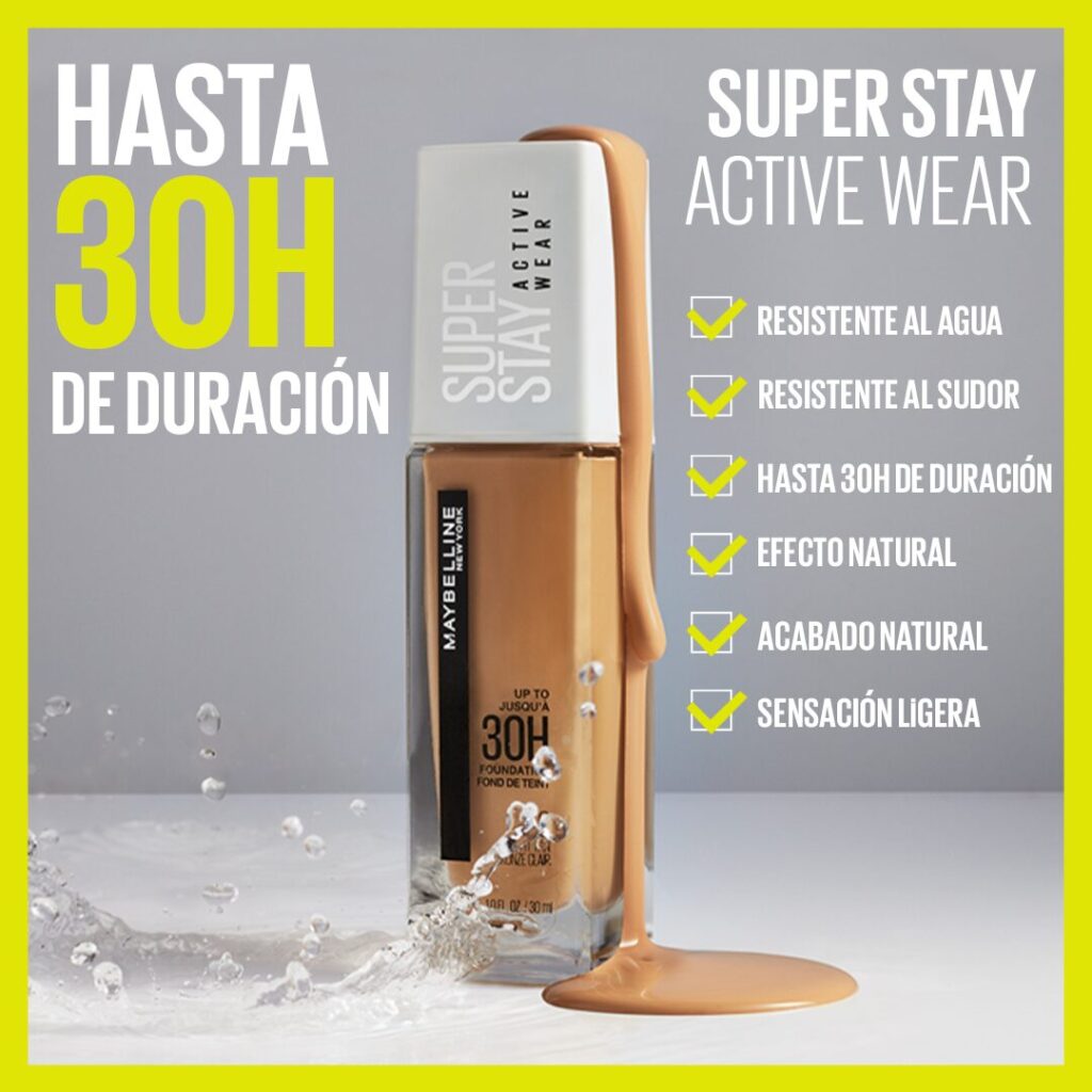 SuperStay Activewear Foundation es creada para la consumidora, que quiere una piel natural y fresca con un acabado mate, es una base de textura ligera, pero con una larga duración e intransferencia. Esta base promete estar en tu rostro con un rendimiento de hasta 30 horas en perfectas condiciones, llevando tu rutina de belleza a nuevas alturas.