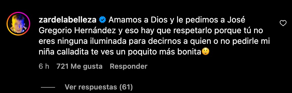 Ante estas declaraciones, Osmel Sousa, mentor de Dayana durante su carrera en el modelaje, respondió con firmeza. En su respuesta, Sousa expresó: «Amamos a Dios y le pedimos a José Gregorio Hernández, y eso hay que respetarlo porque tú no eres ninguna iluminada para decirnos a quién o no pedirle, mi niña. Calladita te ves un poquito más bonita».
