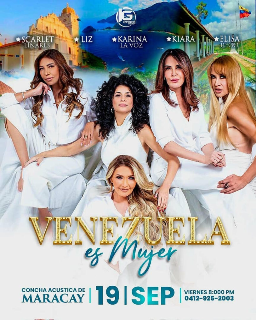 Luego de ofrecer recientemente presentaciones tres conciertos agotados en Valencia, Barquisimeto y Caracas, las cantantes Karina, Kiara, Elisa Rego, Liz y Scarlett Linares llegan el próximo 16 de septiembre a la ciudad de Maracay, con la gira «Venezuela es mujer».