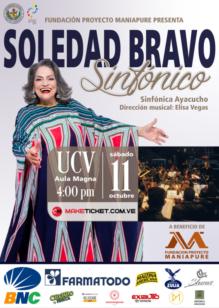 El próximo 11 de octubre de 2025, el icónico Aula Magna de la Universidad Central de Venezuela será el escenario de un evento cultural y humano sin precedentes: Soledad Bravo Sinfónico, un concierto que fusionará la voz emblemática de Soledad Bravo con la majestuosidad de la Orquesta Sinfónica Gran Mariscal de Ayacucho, bajo la dirección de la reconocida maestra Elisa Vegas.