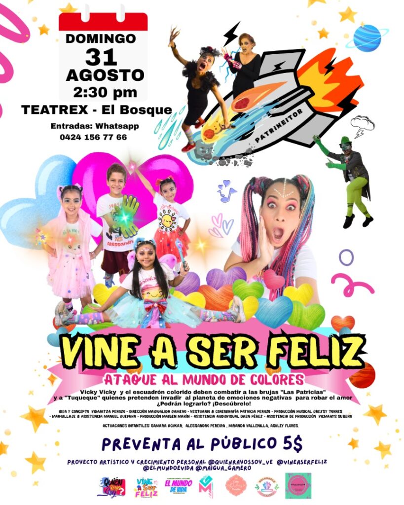 «Vine a ser feliz: Ataque al mundo de colores» es la obra teatral infantil que marca el séptimo aniversario del proyecto artístico y de crecimiento personal venezolano «Quién Rayos Soy». Geometría de colores y valores esenciales se entrelazan en esta pieza única que invita a los niños a reflexionar sobre el amor, la alegría y la amistad en un mundo amenazado por fuerzas negativas.