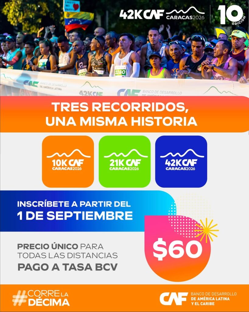 Organizado por CAF, banco de desarrollo de América Latina y el Caribe, el Maratón CAF 2026 ofrece tres distancias competitivas: 42 km, con cupo para 2 mil corredores; 21 km, con 5.200 participantes; y la carrera recreativa de 10 km, con espacio para 2.800 atletas. La inscripción tiene un costo de 60 dólares o su equivalente en bolívares calculado según la tasa del Banco Central de Venezuela del día del pago.