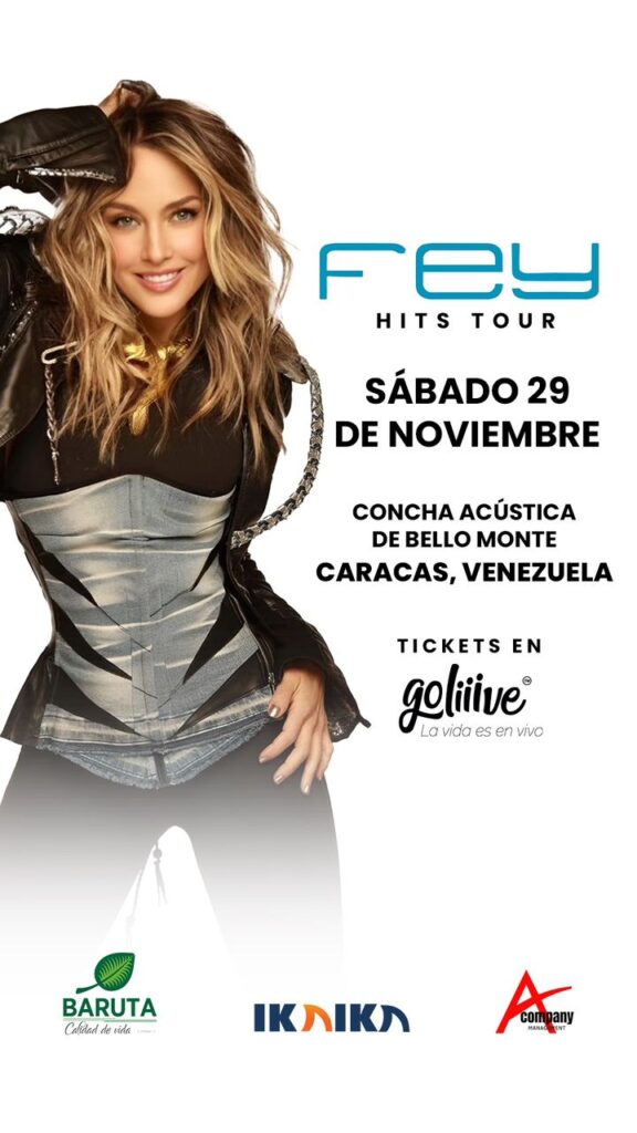 La emblemática cantante mexicana Fey, una verdadera leyenda del pop en español, vuelve a Venezuela después de casi tres décadas para ofrecer un espectáculo único y lleno de nostalgia. Este esperado reencuentro forma parte de su gira mundial «Fey Hits Tour 2025» y tendrá lugar el sábado 29 de noviembre en la Concha Acústica de Bello Monte, Caracas.