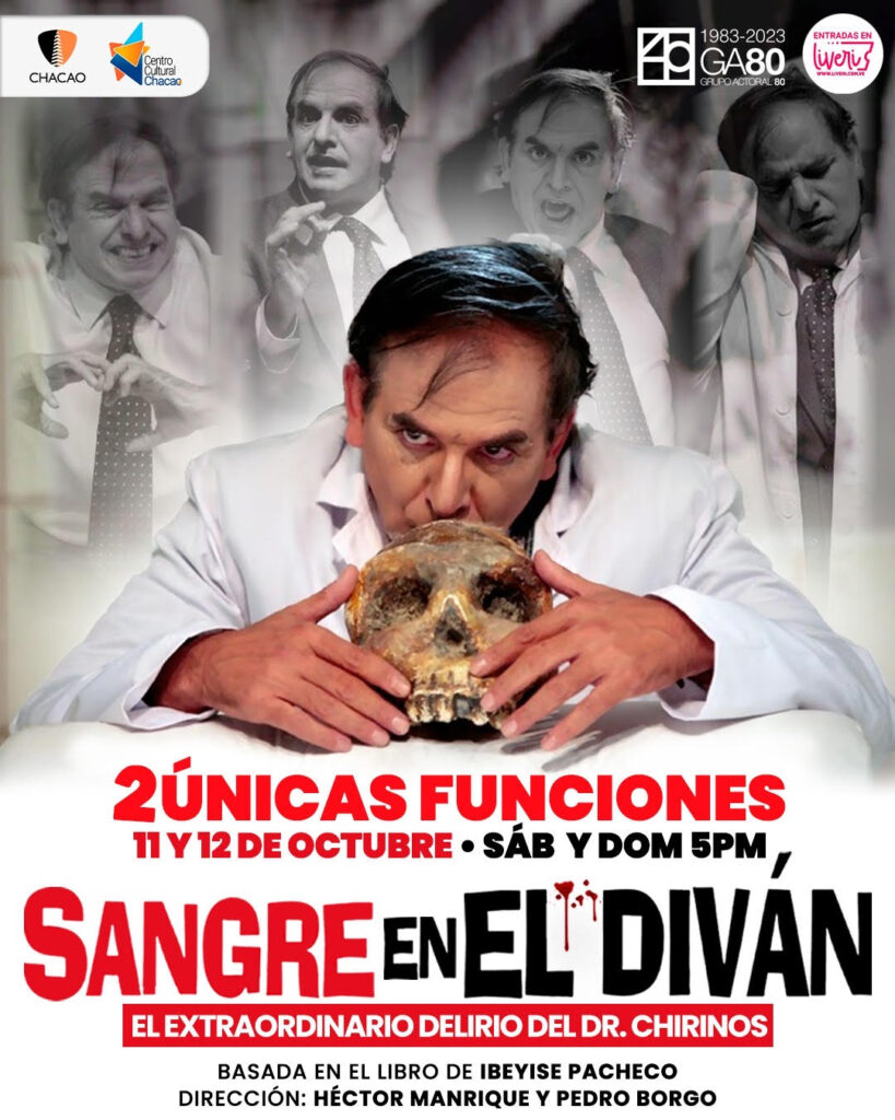 El exitoso monólogo “Sangre en el diván”, protagonizado por el reconocido actor y director Héctor Manrique, regresa al escenario que lo vio nacer hace más de una década para ofrecer sus dos últimas funciones del año en el Centro Cultural Chacao, los días sábado 11 y domingo 12 de octubre a las 5:00 p.m. La producción del Grupo Actoral 80 ofrece entradas solidarias desde 5 dólares, disponibles tanto en taquilla como en la plataforma digital Liveri Tickets.