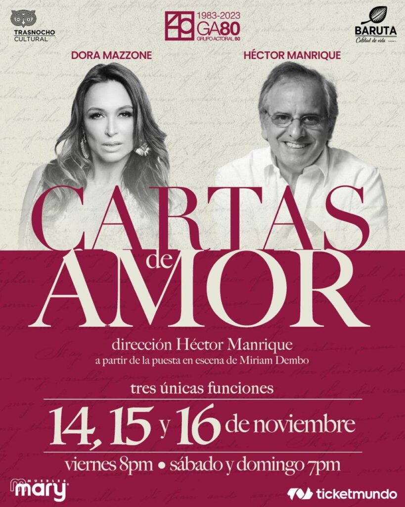 La obra estará en cartelera los días 14, 15 y 16 con Dora Mazzone y Héctor Manrique, y del 21 al 23 de noviembre con Sonia Villamizar y Sócrates Serrano. Las funciones se realizarán en el Teatro Trasnocho, ubicado en el C.C. Paseo Las Mercedes, con entradas disponibles a 15 dólares —o su equivalente en moneda nacional— a través de taquilla, WhatsApp y ticketmundo.com.ve