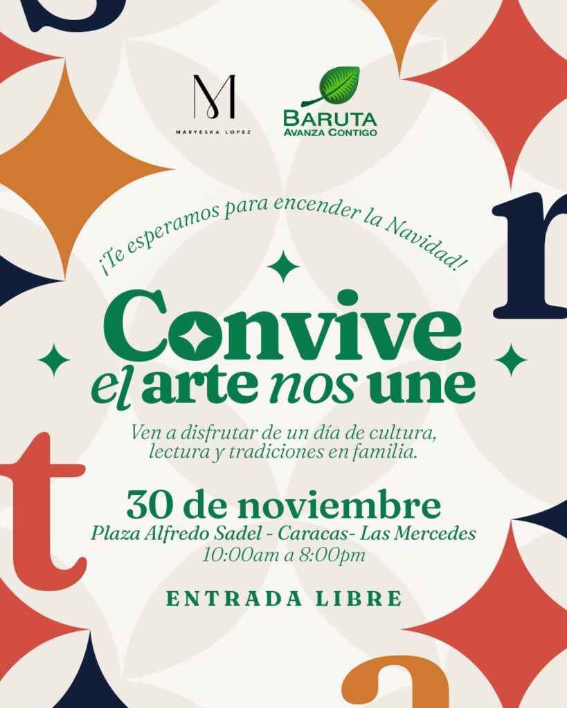 El próximo domingo 30 de noviembre, la emblemática Plaza Alfredo Sadel en Las Mercedes se convertirá en un espacio para celebrar la creatividad, las tradiciones y la comunidad con la llegada de CONVIVE, una jornada organizada por la Alcaldía de Baruta, Huellas al Corazón, Fundación MFM por la Lectura y Nest Coworking. Desde las 10:00 a.m. hasta las 8:00 p.m., los asistentes podrán disfrutar de actividades culturales y artísticas en un entorno seguro, gratuito e inclusivo.
