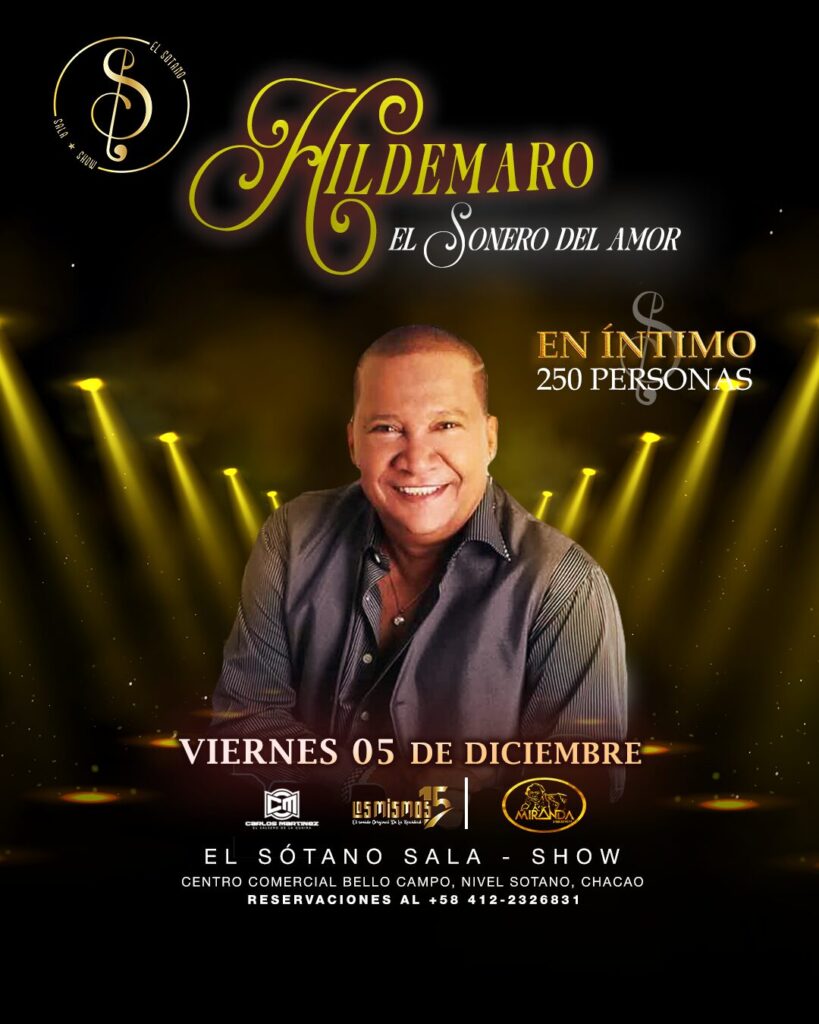 El reconocido cantante venezolano Hildemaro, conocido como “El Sonero del Amor”, regresa a Caracas tras una exitosa gira internacional que lo llevó a más de 30 ciudades alrededor del mundo. El próximo viernes 5 de diciembre, El Sótano Sala-Show abrirá sus puertas para recibirlo en un formato exclusivo y lleno de emoción, bajo la producción de Eventos y Producciones Miranda. Este evento marcará el cierre oficial de su gira 2025, y promete ser una noche única para sus seguidores más fieles.