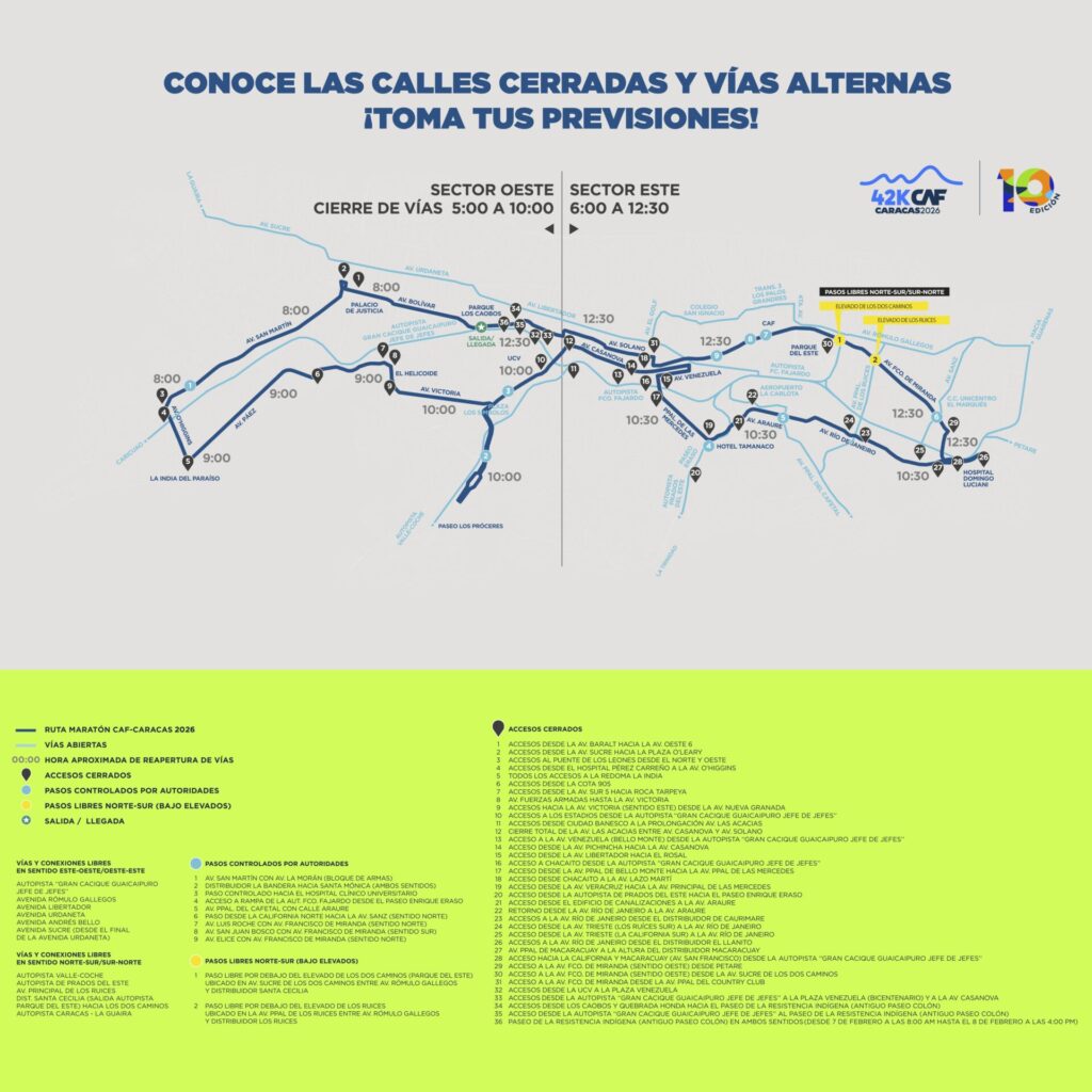 En el oeste de Caracas los cierres arrancarán desde las 5:00 a.m., mientras que en la zona este comenzarán a partir de las 6:00 a.m., con una apertura progresiva del tránsito a medida que avance la carrera. De esta manera se busca minimizar el impacto en la circulación y, a la vez, garantizar una ruta segura para los miles de participantes.