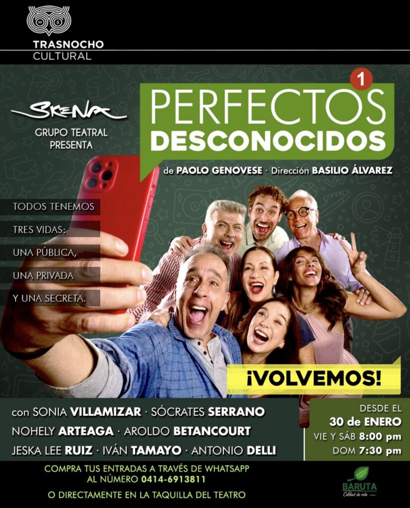 “Perfectos Desconocidos” regresa a la cartelera del Teatro Trasnocho como la comedia más taquillera de 2025, ahora con un elenco renovado y siete semanas de funciones. El espectáculo, original del italiano Paolo Genovese, inicia su temporada 2026 el viernes 30 de enero, con presentaciones los viernes y sábados a las 8:00 pm y domingos a las 7:30 pm.