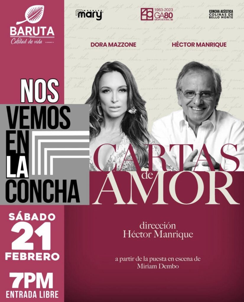 El mes del amor se vive a flor de piel en Baruta con el inicio de la temporada teatral 2026 del programa cultural “Nos Vemos en La Concha”, que arriba a sus siete años con una propuesta cargada de romanticismo y nostalgia. La aplaudida obra “Cartas de Amor”, del dramaturgo estadounidense A. R. Gurney, será la encargada de abrir la programación con una única función gratuita el próximo sábado 21 de febrero, a las 7:00 pm, en la Concha Acústica de Colinas de Bello Monte.