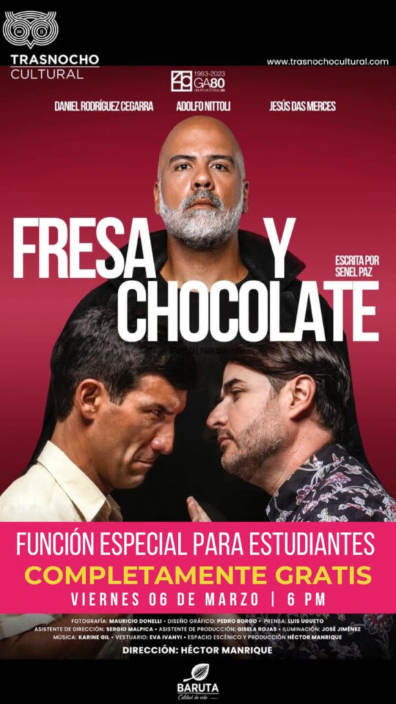 La comedia dramática «Fresa y Chocolate», del cubano Senel Paz y dirigida por Héctor Manrique, llega a sus dos últimas semanas en el Teatro Trasnocho Cultural. Esta obra, interpretada por Daniel Rodríguez, Jesús Das Merces y Adolfo Níttoli, ha capturado al público con su mensaje sobre amistad y tolerancia en la Cuba de los 70.