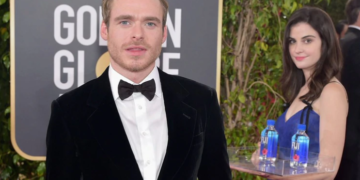 Varios actores fueron fotografiados, mientras una atractiva y sonriente mujer posaba detrás de ellos