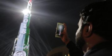 Miles de espectadores se reunieron en los alrededores del edificio más alto del mundo, el Burj Khalifa, para ver el espectáculo que se proyectó sobre...