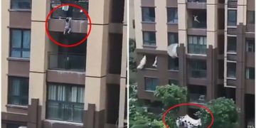 Un niño colgaba de un edificio en China y fue rescatado por unos vecinos que lo esperaban para atraparlo