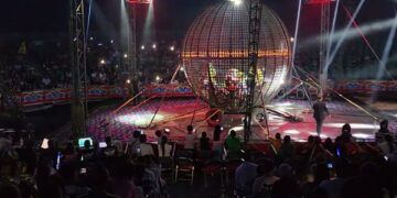 Dos motociclistas sufrieron una caída mientras realizaban su número en la esfera de la muerte del circo Los Valentinos, afortunadamente solo dejaron ligeras lesiones