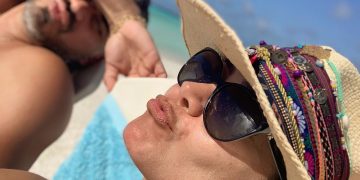 En bikini, en la playa y muy bronceada